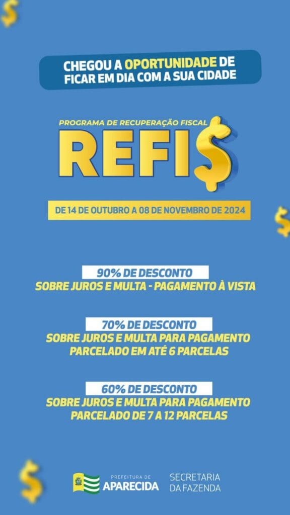 O Programa de Recuperação Fiscal (Refis) 2024 de Aparecida de Goiânia começou nesta segunda-feira, 14 de outubro, e segue até 8 de novembro. Nesse período, moradores e empresas com débitos municipais, como IPTU, ITU e ISS, podem regularizar suas dívidas com descontos de até 90% em multas e juros. A adesão pode ser feita tanto on-line quanto presencialmente nas agências do SAC e em unidades do Vapt-Vupt.