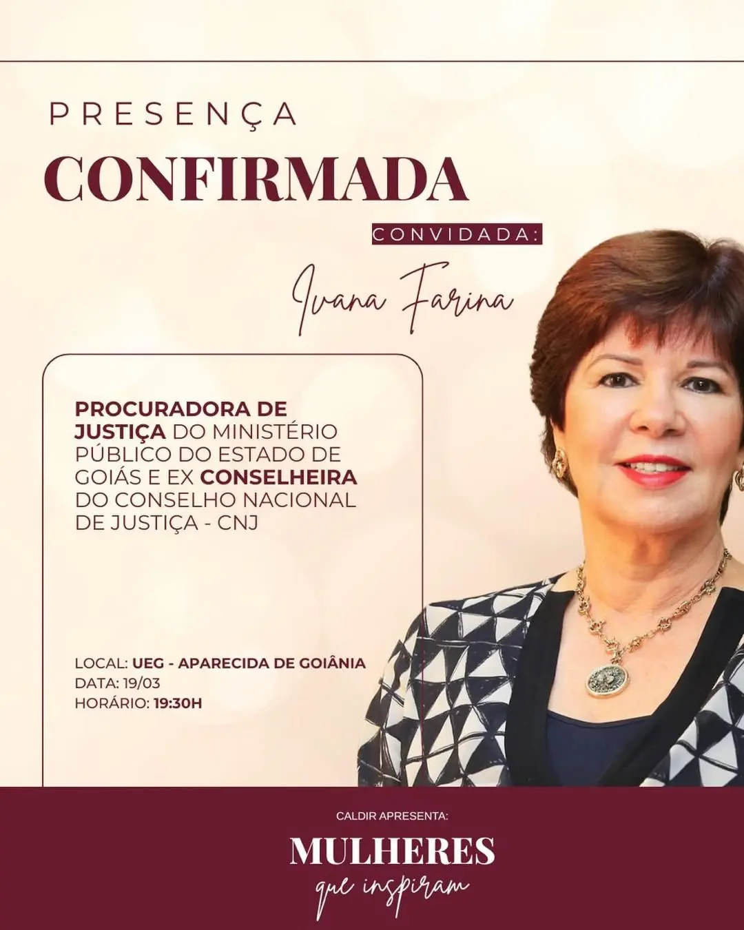 A Universidade Estadual de Goiás (UEG) Câmpus Metropolitano Aparecida de Goiânia, recebe nesta quinta-feira, 19 de março, a roda de conversa “Mulheres que Inspiram”. O encontro será às 19h30, no auditório da unidade, e é promovido pelo Centro Acadêmico Leolice De Ramos Caiado Paranhos (CALDIR), do curso de Direito.